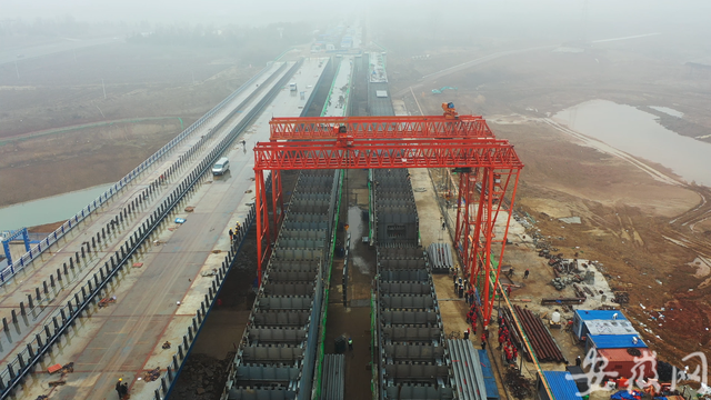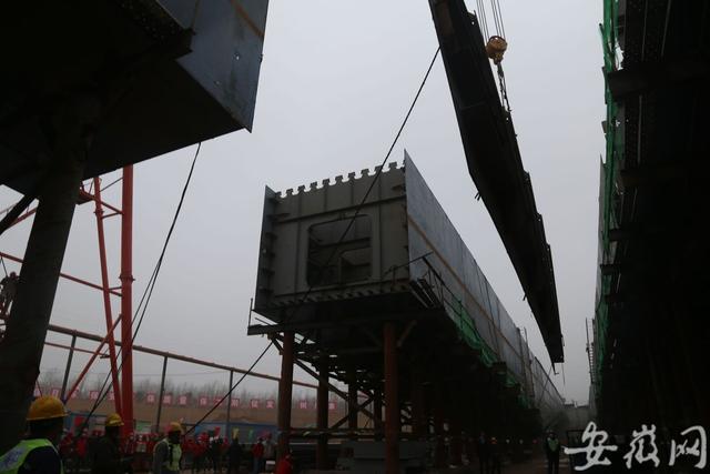由于引江濟淮工程與G312合六葉公路相交,需新建一座公路橋跨越江淮運河。記者在現場看到,大橋雛形已現,工人們正在緊張施工。“G312合六葉公路橋全長280米,總用鋼量達1.6萬噸,橋面總寬52.5米,最大跨度達180米、采用鋼箱梁結構,在同類鋼箱梁中主跨跨度居全國第二、安徽省第一。”中鐵五局引江濟淮項目負責人羅偉平介紹,鋼箱梁由四幅連續梁組成,每幅鋼箱梁采用100米+180米+100米的三跨結構組成,其中3#、4#連續梁已于2020年4月份實現合龍。