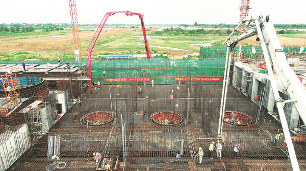 8月12日,在肥西縣嚴店鄉引江濟淮派河口泵站施工現場,工人們正在澆筑泵站第二聯出水流道混凝土。隨著第一車混凝土的順利入倉,標志著該重點工程項目在停工近一個月后正式全面復工。據悉,引江濟淮派河口泵站工程位于派河下游的蓮花圩內,受今年汛情影響,工程在7月19日暫時停工。為了保護安徽省一號工程不受洪水威脅,當地干群和人民子弟兵全力搶險,對派河大堤進行了緊急除險加固,保住了大堤,為項目復工贏得了時間。