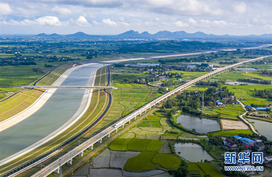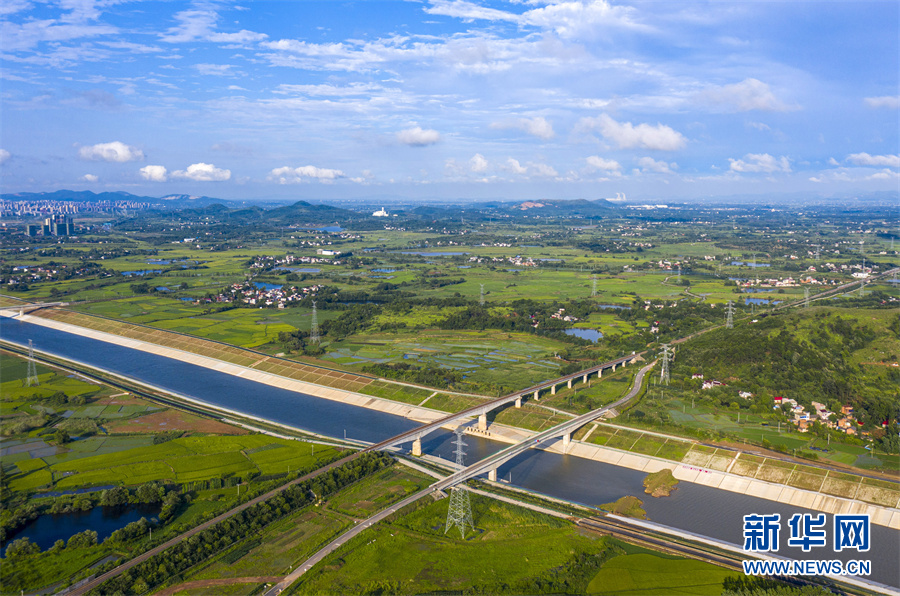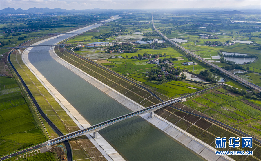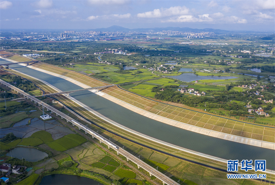 6月28日,安徽省合肥市廬江縣柯坦鎮(zhèn)境內(nèi)的引江濟淮工程雄姿展現(xiàn),河道、高鐵、公路在綠野中交匯,景美如畫。