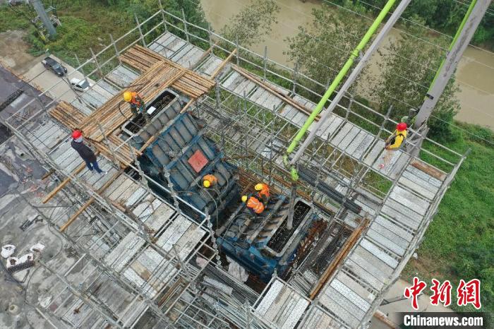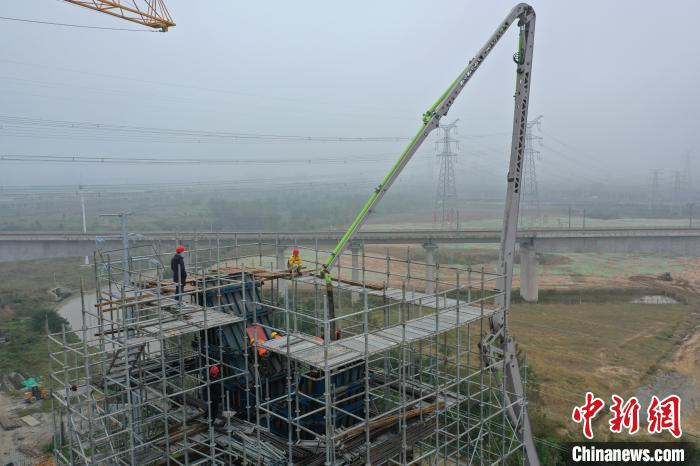 在引江濟淮工程江淮溝通段玉蘭大道橋主塔封頂施工現場,工作人員正在緊張而有序地施工。 韓翔 攝