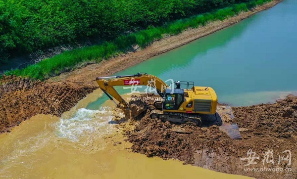 記者在施工現場看到,隨著數臺挖掘機挖開淠河總干渠的攔水圍堰,淠河總干渠的水緩緩流進渡槽,“改道”渡槽,正式上跨引江濟淮運河。
