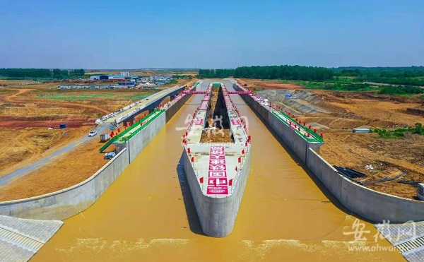 據介紹,淠河總干渠渡槽工程由中鐵四局和中國鐵建大橋局聯合承建,是引江濟淮重大節點工程。渡槽總長 350 米,分左右兩幅,其中鋼渡槽全長246 米,總用鋼量達 2.1 萬噸。設計流量150立方米每秒,設計水深4.0米,為Ⅵ級航道,通行100噸級船舶。橋跨布置采用 68 米 +110米 +68 米的三跨鋼結構桁架式梁拱組合設計,主跨跨度達 110 米,是目前世界上單跨最大的通水通航鋼結構渡槽。渡槽下部為引江濟淮Ⅱ級航道,兩航道高差約30米。