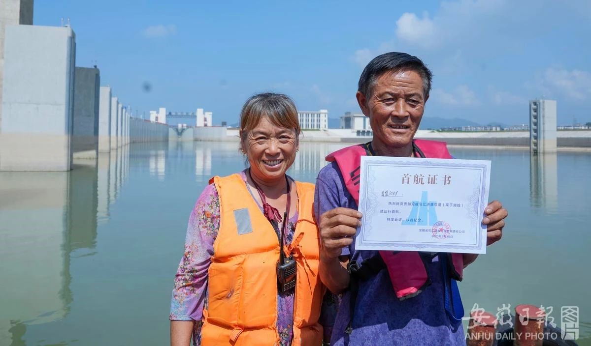 當天上午,記者來到了引江濟淮樅陽船閘。10時58分,伴著汽笛鳴響,裝載680噸鋼材的“昌盛6288”號散貨船由樅陽小港航道向北,緩緩駛過樅陽船閘,進入引江濟淮菜子湖線。作為航道試運行通過樅陽船閘的首艘貨輪,安徽省引江濟淮工程有限責任公司為其頒發(fā)了“首航證書”。