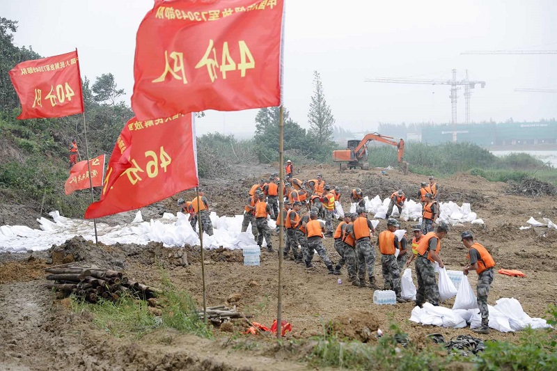 嚴店鄉蓮花圩派河大堤上,官兵奮戰在抗洪搶險一線。